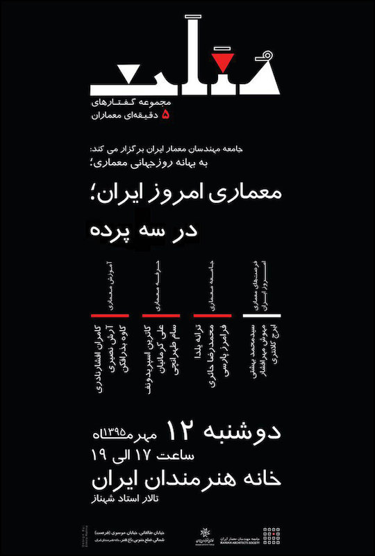 معماری ایران در ۳ پرده با تحلیل آموزش، حرفه، جامعه معماری و فرصتهای معماری امروز ایران، ۱۲ مهرماه در خانه هنرمندان ایران برگزار میشود.