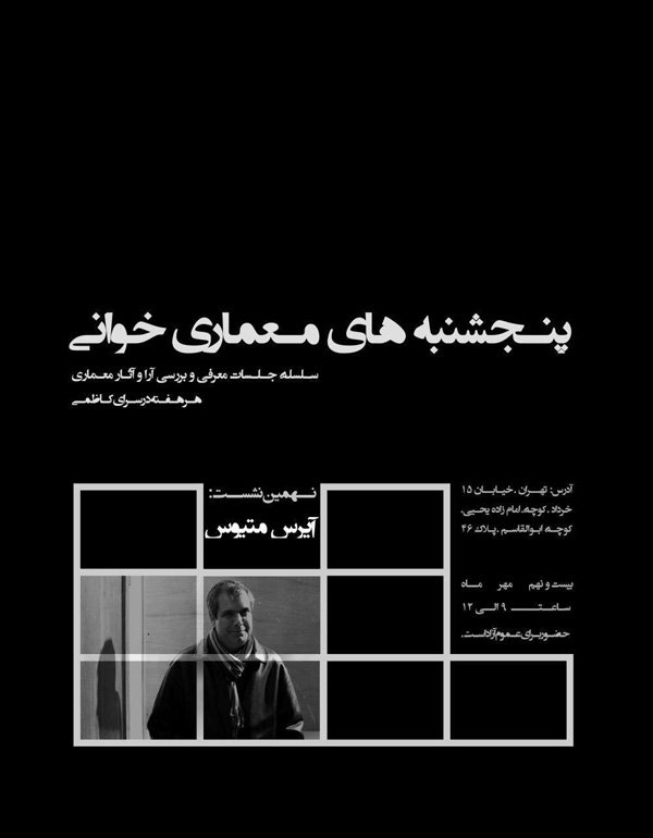نشست نهمِ پنجشنبههای معماریخوانی به آیرس متیوس اختصاص دارد. حضور علاقمندان در این نشست آزاد است و این نشست ۲۹ مهرماه از ساعت ۹ تا ۱۲ در سرایکاظمی به نشانی تهران، خیابان ۱۵ خرداد، کوچه امامزاده یحیی، کوچه ابوالقاسم، پلاک ۴۶ برگزار می شود.
