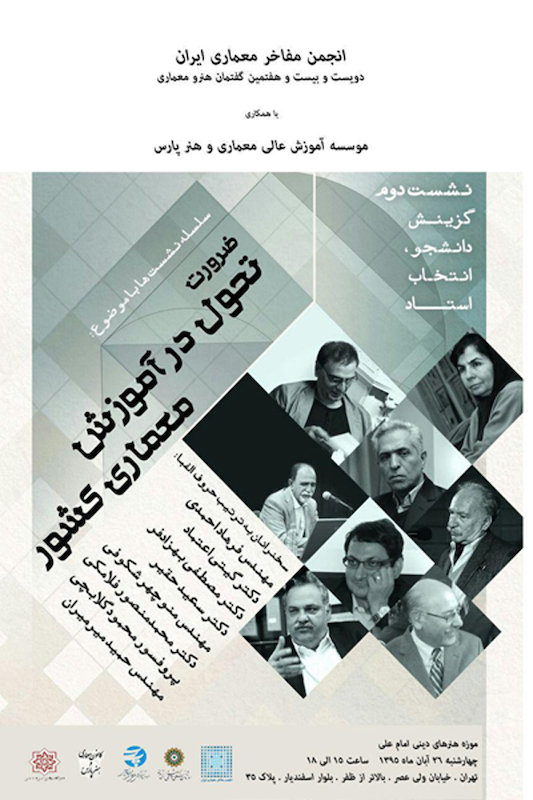 دویست و بیست و هفتمین گفتمان هنر و معماری و دومین نشست گزینش دانشجو، انتخاب استاد در راستای سلسله نشستهای ضرورت تحول در آموزش معماری کشور، توسط انجمن مفاخر معماری ایران و با همکاری موسسه آموزشعالی معماری و هنر پارس در موزه هنرهای دینی امامعلی (ع)، امروز چهارشنبه ۲۶ آبانماه از ساعت ۱۵ تا ۱۸ برگزار میشود.