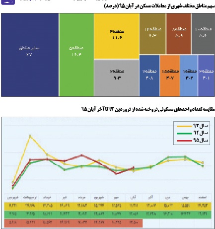 توزيع تعداد معاملات انجام شده برحسب مناطق مختلف شهر تهران در آبانماه سال۹۵ حاكي از آن است كه از ميان مناطق ۲۲گانه شهر تهران، منطقه ۵ با سهم ۱۶.۴ درصدي از كل معاملات، بيشترين تعداد قراردادهاي مبايعهنامه را بهخود اختصاص داده است. همچنين مناطق ۴، ۲ و ۱۴ بهترتيب با سهم ۱۱.۶، ۹.۳ و ۶.۳ درصدي در رتبههاي بعدي قرار گرفتهاند. در مجموع ۷۲.۹ درصد از كل تعداد معاملات انجام شده در شهر تهران مربوط به ۱۰منطقه شهر تهران بوده و ۱۲منطقه باقيمانده ۲۷.۱ درصد از تعداد معاملات را بهخود اختصاص دادهاند.