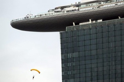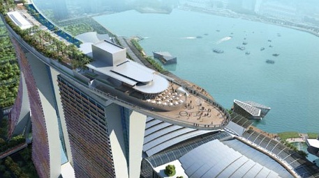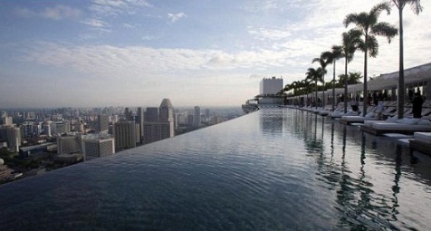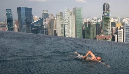 ترسناک ترین استخر جهان در سنگاپور قرار دارد این استخر در پارک Sands Skypark (پارک شنی آسمانی) در بالای ۳ آسمان خراش قرار دارد .این استخر بالای طبقه ۵۵ است و نمای شهر به زیباترین حالت در حال شنا قابل مشاهده هست . طول این استخر ۱۵۲ متر است و همانطور که در عکس می بینید دارای لبه نیست و اگر شما به کناره ها بروید به جای اینکه به پایین سقوط کنید به درون یک حوضچه می افتید که دور تا دور این استخر را فرا گرفته و نقش دیگر آن پمپ کردن آبی است که از کناره های استخر به پایین می ریزد و برگرداندن دوباره آن به داخل استخر است. این پارک توسط Moshe Sadie طراحی شده . ورودی این پارک برای مسافران و توریست ها مجانی است اما برای ساکنان سنگاپور ۷۰ دلار است .