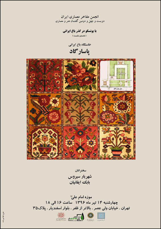 «نشست با یونسکو در گذر باغ ایرانی؛ خاستگاه باغ ایرانی پاسارگاد» نشستی است که به باغهای ایرانی از ابتدای شکلگیری آنها تا به امروز و نقشی که در شهرها داشتهاند خواهد پرداخت. سخنرانی این نشست را شهریار سیروس و بابک ایقانیان برعهده دارند.