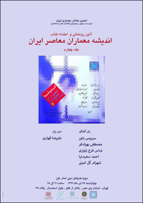 آیین رونمایی و امضای جلد چهارم کتاب اندیشه معماران معاصر ایران، ۲۸ تیرماه با سخنرانی تعدادی از معماران معاصر ایران درباره کتاب، در موزه هنرهای دینی امام علی (ع) برگزار میشود.