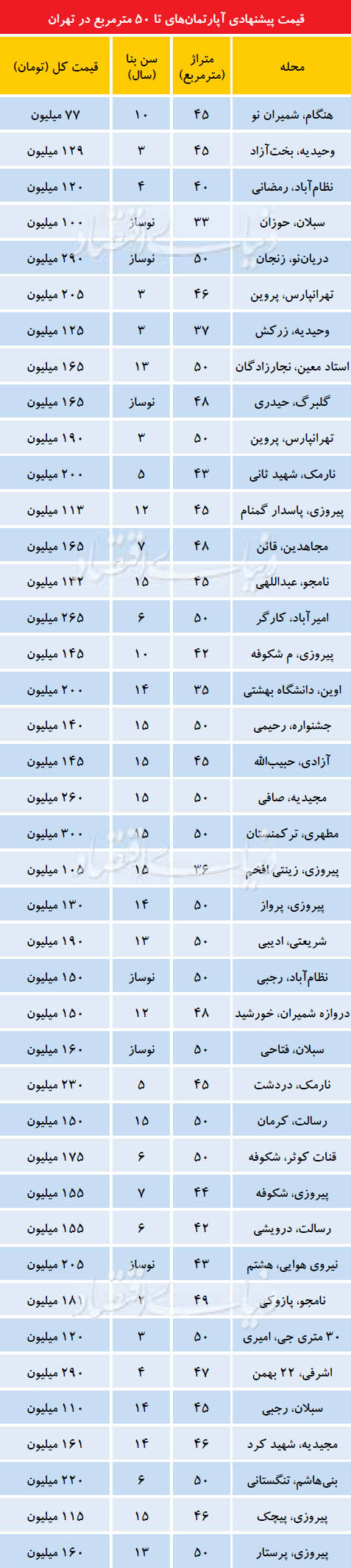 بررسی موتورهای جستوجوی ملکی و آگهیهای درج شده در نیازمندیهای مطبوعات نشاندهنده رویه متفاوت قیمتگذاری آپارتمانهای نقلی با مساحت حداکثر 50 مترمربع است. قیمت پیشنهادی بسیاری از این آپارتمانها مشابه قیمتهای متعارف منطقه در دامنه متراژهای بزرگتر با امکانات معمول و غیرلوکس است و بر خلاف سنت همیشگی، گرانتر از قیمت مورد انتظار منطقه فایل نشدهاند.