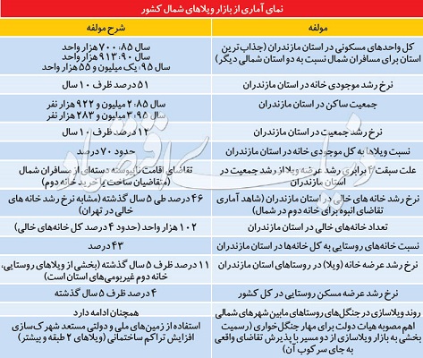 به این ترتیب، بخش زیادی از موجودی مسکن استان مازندران، در قالب «خانه دوم» یا شهرکهای مسکونی خصوصی و دولتی، برای اقامتهای ناپیوسته و چند روز در سال، طی این مدت ایجاد شده است. یک آمار دیگر که اطلاعات مکمل درباره ساخت و سازهای غیرمجاز در شمال (ساخت در اراضی ممنوعه روستاهای جنگلی) محسوب میشود، به «نسبت خانههای روستایی به کل واحدهای مسکونی استان مازندران» مربوط است. در فاصله سالهای ۹۰ تا ۹۵، کل موجودی مسکن روستایی کشور ۴ درصد افزایش پیدا کرده است بهطوری که در حال حاضر از ۲۲میلیون و ۸۰۰هزار واحد مسکونی تحت سکونت خانوارها در کل کشور، ۴ میلیون و ۳۷۷ هزار واحد، در روستاها قرار دارد. اما طی ۵ سال گذشته، واحدهای مسکونی در روستاهای مازندران، ۱۱درصد افزایش یافته است که به معنای رشد معادل دو برابر میزان رشد عرضه مسکن روستایی در کل کشور است. ۴۳ درصد کل واحدهای مسکونی استان مازندران در روستاها قرار دارد. این نسبت در کشور، کمتر از ۲۴ درصد است. به گزارش «دنیای اقتصاد»، تعداد خانههای خالی در شمال کشور، نقش تقاضای اقامت ناپیوسته –تقاضای غیربومی- در ویلاسازیها را مشخص میکند و علت شیب ۴ برابری رشد عرضه مسکن در مقایسه با رشد جمعیت در استان مازندران را روشن میسازد. تعداد خانههای خالی در استان مازندران طی ۵ سال گذشته، ۴۶ درصد افزایش پیدا کرده و به ۱۰۲ هزار واحد رسیده است.