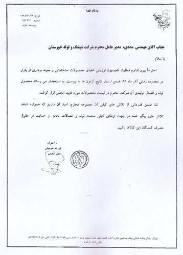 برپایه این مکاتبه ؛ با توجه به نمونه برداری انجمن تولید کنندگان لوله و اتصالات پی وی سی از محصولات آن شرکت در بازار کل کشور، شرکت مذکور همه موارد استاندارد را با موفقیت پشت سرگذاشته و حائز دریافت رتبه برتر شده است.