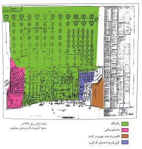 در این نقشه شهر آبادان در جنوب شرقی پالایشگاه قرار گرفته و بهواسطهی پارکی تازه ساز با عنوان Park Area از ردیف خانه های کارگری (کولی لاینها) جدا شده است.